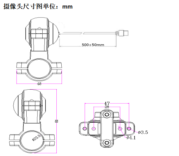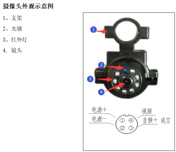 车载高清防水摄像头,采用金属外观设计,耐高温,摄像头角度可调,安装方便 适用于公交大巴,两客一危,普货等各类(后视镜带钢管的)大型车辆 两侧盲区 监控用